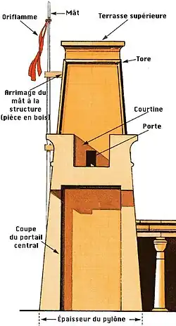 Pylon[3] má obdélníkový půdorys a má podobu komolého jehlanu se stěnami zakončenými římsou. Je vždy plný, uvnitř bývá jen úzké schodiště, jímž je možno vystoupit na střešní terasu a ke zděnému mostku spojujícímu oba z páru pylonů. Všechny zdi (a zejména zdi přední) mohou být zdobeny náboženskými a mytologickým výjevy a nápisy. Před pylony stávaly vysoké dřevěné stožáry s vlajícími úzkými praporci, někdy i obelisky a kolosální sochy panovníků.
