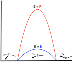 Na velikost energetické bariéry má největší vliv druh atomů účastnících se inverze. U amoniaku je tento děj za pokojové teploty rychlý, probíhá 3×1010krát za sekundu; vysokou rychlost způsobují nízká energetická bariéra (24,2 kJ/mol), malá šířka bariéry (odlišnost jednotlivých geometrií), a nízká hmotnost atomů vodíku, a navíc ještě 80násobné urychlování v důsledku kvantového tunelování.[4] Inverze fosfanu (PH3) je mnohem pomalejší, protože má výrazně vyšší aktivační energii (132 kJ/mol).[5] Terciární aminy (RR′R"N) jsou obvykle opticky nestálé (enantiomery se za pokojové teploty rychle racemizují), ale P-chirální fosfiny vykazují vyšší stabilitu.[6] Obdobně jsou stálé i vhodně substituované sulfoniové soli, sulfoxidy, a arsiny. Na energetickou bariéru mají vliv též sterické efekty.