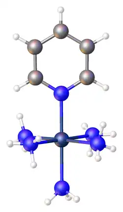 Vzhledem k poměrně velkému úhlu C-N-C na sebe 2,6-vodíkové atomy navzájem působí za tvorby [M(py)6]z komplexů. Bylo popsáno několik homoleptických oktaedrických pyridinových komplexů. Takovéto komplexní ionty se vyskytují v solích [Ru(py)6]Fe4(CO)13 a [Ru(py)6](BF4)2.[3][4]
