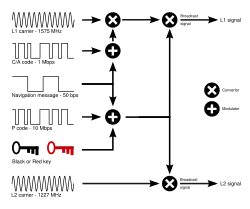 | L1 (1575,42 MHz = 10,23 MHz × 154) | In-Phase (I) | Precision P(Y) kód | Precision P(Y) kód Military (M) kód |