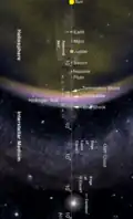 - Proud elektricky nabitých částic unikajících ze Slunce tvoří tzv. sluneční vítr. Na okraji heliosféry se částice slunečního větru prudce zpomalují srážkami s mezihvězdnou hmotou. Pohyb heliosféry galaktickým prostorem vytváří v médiu mezihvězdných nabitých částic rázovou vlnu podobně jako ve vzduchu let nadzvukového letadla.
