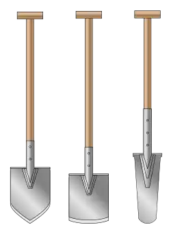 Konec rukojeti ve tvaru písmene T nebo D umožňuje lepší úchop a účinnější obouručné působení na rýč. Čepel je na svém spodním konci naostřena, aby snadněji pronikala do zeminy. Vrchní část čepele bývá opatřena nášlapem a je tak možno o něj opřít chodidlo a zvýšit tlak na rýč, který se snáze zaryje do zeminy.
