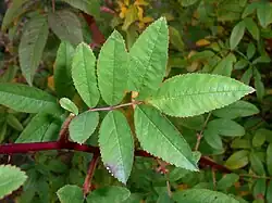 Listy s řapíky jsou složené z pěti až devíti tuhých, široce eliptických až úzce vejčitých lístků 2 až 5 cm dlouhých a 1 až 2 cm širokých, které jsou při bázi i na vrcholu klínovitě špičaté, po obvodě mají dvacet až třicet drobných ostrých zoubků, na lícní straně jsou tmavě zelené a lysé, na rubové světlejší a někdy chlupaté. Na řapících i středních žilkách listů vyrůstají další, tentokrát drobné ostny. Listy na podzim před opadem mění svou barvu do atraktivních odstínů červené, později uschnou a zůstávají na rostlině dlouho do zimy. Palisty jsou čárkovité, asi 2 cm dlouhé.