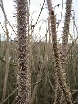 Nízké, prutnaté keře vysoké do 1,5 až 2 metrů vytvářející husté a neprostupné polykormony. Rostou z hlavního kůlovitého kořene s mnoha odbočnými a mělčeji kořenícími postranními výběžky, z kterých vyrostou nové větve, stejně jako z adventivních pupenů na kořenech. Stonky a větve jsou tuhé, málo ohebné, v mládí hustě chlupaté a porostlé ostny vyrůstajícími obvykle ve dvojicích u báze palistů. Ostny bývají početné, přímé, štíhlé a stejně zelené jako větve, které ve stáří tmavnou. Listy s asi 1 cm dlouhými řapíky vyrůstají střídavě a jejich lichozpeřené čepele s pěti až devíti lístky jsou dlouhé 7 až 11 cm. Lístky bývají široce eliptické až podlouhlé, velké 3 až 5 × 2 až 3 cm, na bázi klínovité a na konci zašpičatělé. Jsou přisedlé, kožovité, nápadně svraskalé, mají vyniklou žilnatinu, na svrchní straně jsou leskle zelené a na spodní poněkud světlejší a matné.