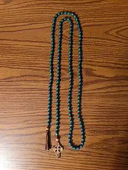 - z textilií: konopný provaz (růžence mnichů žebravých řádů), z kroucené bavlněné nebo hedvábné šňůry, z dracounu.