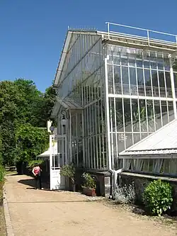 V horní části zahrady, nad parterem, se nachází skleník s rozlohou 1200 m². Ten slouží nejen pro pěstování rostlin pro tuto zahradu, ale i pro celý areál. Část skleníku, ve které jsou pěstovány exotické rostliny včetně orchidejí a je zde i menší jezírko s rybami, je za poplatek otevřena veřejnosti.[1] Vedle skleníku roste cizokrajná wistárie čínská, kvetoucí fialově několikrát do roka. Vedle skleníku se nachází hospodařská budova a kavárna.[3]