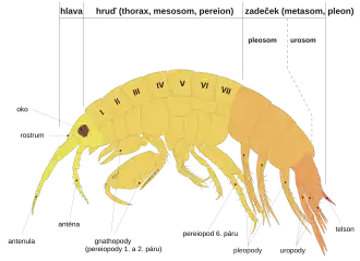Tělo různonožce se dělí na hlavu, hruď a zadeček. Hlava má 2 páry tykadel: antenuly a antény. Hlava je srostlá s jedním hrudním článkem v hlavohruď. Hruď má volných 7 hrudních článků, na nichž jsou končetiny. Na zadečku jsou 3 páry plovacích nožek a 3 páry skákacích nožek. Na konci zadečku je rozvětvený telson.[zdroj?]