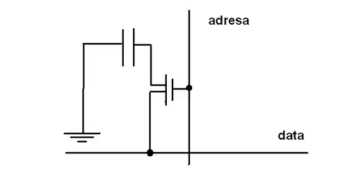 Zapojení paměťové buňky pro 1 bit v paměti DRAM.