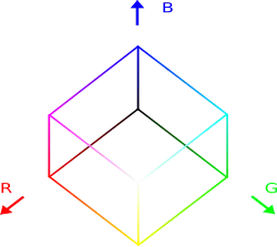 Barevný RGB model mapovaný do krychle. Hodnoty se zvětšují podél osy x (červená), osy y (zelená), a osy z (modrá). Barva v RGB modelu může být popisována zastoupením každé barvy – červené, zelené a modré. Každá může kolísat na minimum (zcela tmavá barva) a na maximum (plná intenzita). Pokud jsou všechny barvy na minimu, odpovídá výsledek černé, pokud jsou všechny barvy na maximu, odpovídá výsledek bílé. Tyto barvy mohou byt kvantifikovány několika různými způsoby: