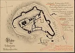 Spolu s obytnými a hospodářskými budova vznikalo také opevnění. Na západní straně hrad původně chránila slabá hradba se čtverhrannými a dovnitř otevřenými baštami. Ta byla nahrazena nedokončeným mohutným opevněním s množstvím ve své době moderních prvků, jejichž provedení však ukazuje na nepochopení jejich teoretické funkce. Je proto možné, že výstavba rozsáhlého opevnění měla částečně demonstrační charakter.[17]