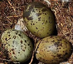 Hnízdí v početných koloniích na pobřeží, místo pro hnízdo je vybíráno oběma partnery, v případě úspěšného hnízdění se na ně vrací každý rok. Nachází se na zemi, případně na skalní římse. 2–4, nejčastěji 3 vejce jsou účinně bráněna a inkubována oběma rodiči po dobu 28–30 dnů. Díky světle žlutohnědému zbarvení s tmavě hnědými skvrnami různé velikosti jsou dobře maskována. Mláďata se líhnou pokryta prachovým peřím s otevřenýma očima a během několika hodin opouští hnízdo. Při dožadování klovou do červené skvrny na zobáku rodičů, kteří jim následně vyvrhnou potravu. První zkoušky letu podnikají ve stáří 35–40 dnů a plně vzletná jsou ve věku 5–6 týdnů. Rodiči jsou krmena až do stáří 11–12 týdnů ale krmení s může protáhnout až do 6 měsíců věku mláďat. Samec krmí mladé častěji před jejich vzletností, samice zase po vzletnosti.