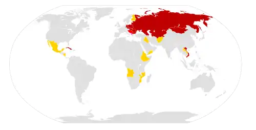 ![]() Členství v RVHP v roce 1986, členové tmavě červeně, členové nespolupracující fialově, přidružení světle červeně, pozorovatelé žlutě | |