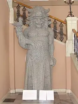 Pohanský bůh má mužské tělo, hlava má podobu lva s úšklebkem šelmy, na hlavě přilbici v podobě býčí hlavy s rohy, oblečen je do suknice zdobené ornamenty se širokým zdobeným pasem se sponou ve tvaru slunce, z pod suknice vyčnívají lidské nohy obuté do krpců. V pravé ruce drží roh hojnosti, na kterém sedí kachna, levou rukou se opírá o sekeru na dlouhém topůrku, snad valašku. Umístěna je na katastru obce Dolní Bečva, přibližně 1 kilometr jihozápadně od Pusteven, s tváří otočenou k vrcholu Radhoště.[1]