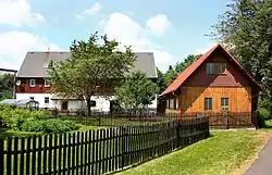 - Dva z radenovských domů s hrázděným patrem jsou chráněné jako kulturní památka. Jednopatrový dům čp. 4 má valbovou střechu a některá okna zdobená vyřezávanými šambránami.[21] Obytný dům usedlosti čp. 9 pochází ze druhé poloviny devatenáctého století. Na jeho střeše se dochovaly dva ozdobné hromosvody.[22]