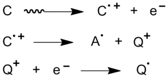 Záření α, β, γ nebo rentgenové záření způsobí vytržení elektronu z iniciátoru, po němž následuje disociace a záchyt elektronu za vzniku radikálu.[2]