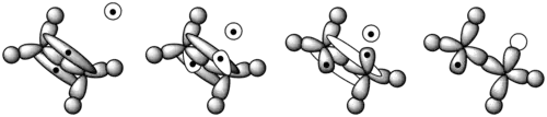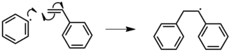 - Na monomer: Atom vodíku se odštěpí z monomeru, na němž vzniká radikál, jehož rezonanční stabilizace zamezuje další propagaci.[2]