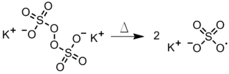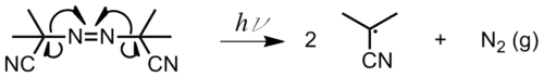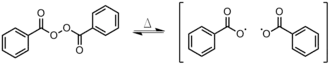 - Iniciátor se zahřívá, dokud nedojde k homolytickému rozštěpení molekul za vzniku dvou radikálů. Tento postup se nejčastěji používá u organických peroxidů a azosloučenin.[2]