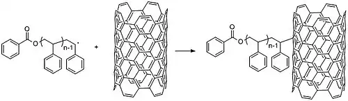 Radikálová polymerizace má využití i ve výzkumu, například při funkcionalizaci uhlíkových nanotrubic.[26] Připojením malých molekul na vnější stěny nanotrubic lze tuto jejich vlastnost omezit a ovládat jejich interakce s okolím. Použití polymerů místo malých molekul mění vlastnosti nanotrubic (které také mohou ovlivňovat vlastnosti polymerů).[24] Byly připraveny uhlíkové nanotrubice pokryté polystyrenem získaným radikálovou polymerizací, následně při 130 °C smíchaným s uhlíkovými nanotrubicemi a připojeným na jejich vnější stěny.[27]