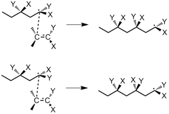 Koncový uhlík má hybridizovaný orbital sp2 a vytváří rovinnou strukturu. Při polymerizaci obecného monomeru CH2=CXY jsou dvě možnosti, jak se monomer může přiblížit ke koncovému uhlíku: zrcadlové přiblížení (pokud jsou všechny substituenty na stejné straně) a nezrcadlové přiblížení (substituenty se nacházejí na různých stranách molekuly). Pokud před připojením dalšího monomeru nedojde k volné rotaci, tak zrcadlové přiblížení povede ke vzniku izotaktického a nezrcadlové přiblížení povede ke vzniku syndiotaktického polymeru.[4]