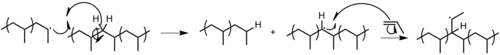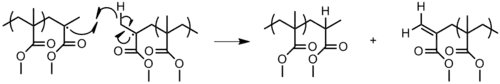 - Radikálová disproporcionace: Atom vodíku se přesune z jednoho řetězce na druhý, čímž vznikne jeden polymer, který má na konci molekuly násobnou vazbu, a druhý, u něhož je na konci molekuly jednoduchá vazba.[4]