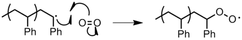 - Reakce s nečistotami nebo inhibitory: Častým inhibitorem je kyslík. Narůstající řetězec může reagovat s molekulárním kyslíkem za vzniku kyslíkového radikálu, který je mnohem méně reaktivní, čímž se propagace výrazně zpomalí.