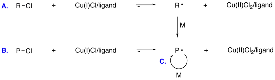Radikálová polymerizace s přenosem atomů se skládá z těchto dílčích reakcí:
