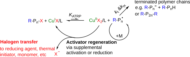 Radikálové polymerizace s přenosem atomů bývají katalyzovány komplexy přechodných kovů, používají se hlavně Cu, Fe, Ru, Ni, nebo Os, jako iniciátory slouží alkylhalogenidy (R-X).V průběhu reakce se neaktivní částice aktivují tvorbou radikálů jednoelektronovým přenosem působením komplexu; současně se přechodný kov oxiduje. Tímto vratným dějem rychle vzniká rovnováha vytvářející nízkou koncentraci radikálů; množství polymerních řetězců je určováno množstvím iniciátorů. Každý narůstající řetězec má stejnou pravděpodobnost propagování monomery za tvorby aktivních či neaktivních řetězců (R-Pn-X), z tohoto důvodu bývá rozdělení molárních hmotností produktů úzké.