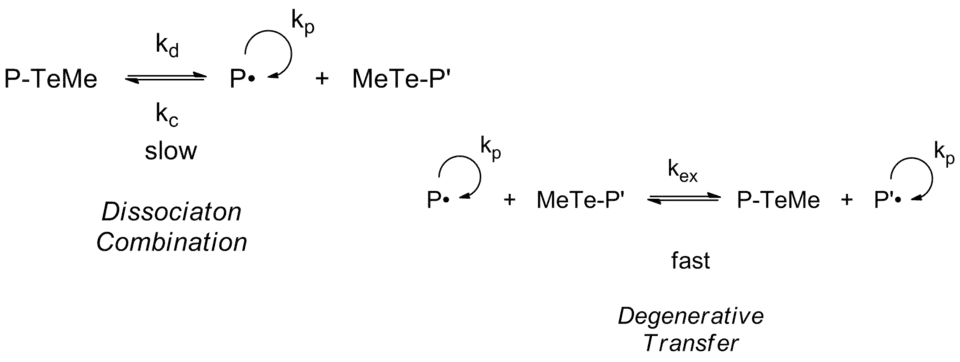 Polymerizace řízené telluridy je možné provést za vratného přenosu řetězce s využitím homolytické substituce po tepelné iniciaci. V jedné kinetické studii bylo ale zjištěno, tyto polymerizace probíhají převážně degenerativním přenosem.[16]