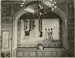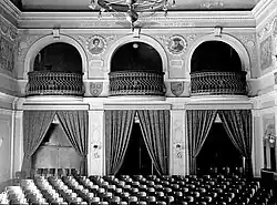 Do divadelního sálu se vstupuje vedlejším vchodem ve vstupním průčelí, které vede chodbou k šatnám, k schodišti k balkónkům a předsálí. Z něj se vstupuje třemi vchody krytými závěsy v zadní stěně sálu. Jeho stěny jsou artikulovány rytmem obdélníkových oken v přízemí a štukových pilastrů posazených na sokl z tmavě hnědého dřevěného obložení. Na ně je posazena profilovaná kordonová římsa se zubořezem a další úzký pás, jehož lizény navazují na linie pilastrů. Na něj dosedají půlkruhové výklenky s klenáky, ve kterých jsou vyvedeny malby.Tmavé obložení u paty sálu spolu s okenními závěsy a poprsní jeviště kontrastuje s bledě oranžovými plochami a horizontálními liniemi v bledě modré barvě na horní části stěn. Pilastry jsou ozdobeny reliéfní štukovou výzdobou a jsou osazeny svítidly. Volné plochy v rozích u jeviště zabírají malby. V zadní stěně tvořila linie pilastrů s oblouky rámec půlkruhových balkónů s železným dekorativním zábradlím, ve kterém byly umístěny lože. Po stranách středního oblouku byly medailony s portréty Josefa Slavíka a Beneše z Hořovic. Na protilehlé straně má jeviště předsazenou předscénu, na kterou vede po levé straně úzké schodiště. Jeho portál je zvýrazněn vertikálně bledě modrou barvou. Vně oblouku elipsoidní výseče jsou vyvedeny bohaté štukové reliéfy. Na jeho vrchol byl pak vsazen znak v rokajovém rámci. Sál využíval nejen Spolek divadelních ochotníků, ale často sloužil pro plesy a taneční zábavy. V roce 1911 bylo do sálu zavedeno elektrické osvětlení. V roce 1937 bylo upraveno jeviště.