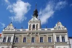 Nad střední částí průčelí je hranolová čtvercová věž se třemi okny zakončená malými štítky s kulatými ciferníky hodin. Nad bání s lucernou je špice s dvěma makovicemi. Ve druhém poschodí je ve středu mezi okny znak města a český lev. Na věži jsou sochy Spravedlnosti a Samosprávy.
