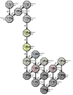 Radon-222 vzniká v uran-radiové přeměnové řadě alfa rozpadem radia-226, s poločasem přeměny 1600 let. Dále se přeměňuje na polonium-218 s poločasem přibližně 3,82 dne, je tak nejstabilnějším izotopem radonu. Konečným produktem řady je stabilní olovo-206.