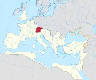 Římská říše kolem roku 120, červeně zvýrazněna Raetie