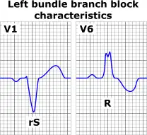 Pravá komora je aktivovaná normální cestou (pravým raménkem), mezikomorová přepážka zprava doleva (normálně je aktivovaná zleva doprava) a levá komora je aktivovaná cestou pracovního myokardu zprava se zpožděním. Na EKG se projeví rozšířením QRS nad 120 ms, obrazem rS či QS ve svodech V1 a V2 a RsR´ ve V6. T vlna má opačnou výchylku oproti převažující výchylce QRS komplexu.