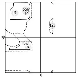 Rozložení těchto skupin je pro většinu peptidů stejné, výjimky tvoří glycin a prolin. Pro glycin se, tím že má postranní skupinu nahrazenu atomem vodíku, značně zvyšuje plocha povolených skupin v grafu a tím i jeho flexibilita. Pro prolin se kvůli přítomnosti cyklické postranní skupiny napojené na hlavní řetězec značně snižuje počet povolených kombinací úhlů φ a ψ, které by nevedly ke srážce atomů, tím se jeho flexibilita naopak silně zmenšuje. U ostatních aminokyselin nejde ani tak o složení a délku postranního řetězce, ale spíš o přítomnost Cβ, který u nich nejvíce ovlivňuje počet povolených kombinací úhlů φ a ψ. Přednostně zaujímané kombinace vazebných úhlů odpovídají hodnotám reálných tvarů, tvořených aminokyselinami v peptidovém řetězci – tj. pravotočivým helixům a beta listům.[2]