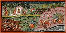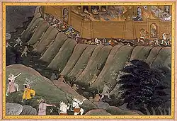 Lakšmana (s lukem) na návštěvě Kiškandě; po jeho levici Sugríva s Tárou, po pravici hanumán (malba, kolem r. 1700)