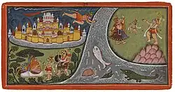 Hlavní hrdina eposu Ráma (vpravo) sedící na ramenech Hanumána v zápase s Rávanou (malba z Tamilnádu, kolem roku 1820, dnes uložena v Britském muzeu)