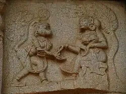 Hanumán podává Sítě Rámův prsten (kamenný reliéf)