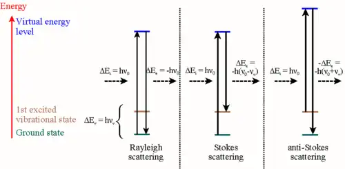 Je-li dopadající energie fotonů rovna , pak záření rozptýlené prostřednictvím Ramanova rozptylu má energii fotonů rovnou kde odpovídá energetickému rozdílu kvantových hladin dané látky. Rozptýlené světlo má frekvenci (n-tý Stokes) nebo (n-tý anti-Stokes). Při Stokesově rozptylu má vyzářený foton nižší energii než dopadající foton (tj. látka absorbuje část energie). Při anti-Stokesově rozptylu má vyzářený foton vyšší energii než dopadající foton (tj. látka ztrácí část energie). Podle hodnot lze pak usuzovat na některé fyzikální vlastnosti dané látky.