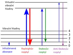 - Malá část molekul se už před interakcí s fotonem nachází v excitované vibrační hladině. Po interakci dopadajícího fotonu se taková molekula vrací na základní vibrační hladinu. Energie rozptýleného fotonu je tedy opět jiná než energie fotonu původního. Takový rozptyl se nazývá anti-Stokesův rozptyl a opět nese analytickou informaci.