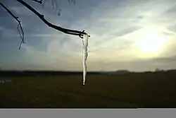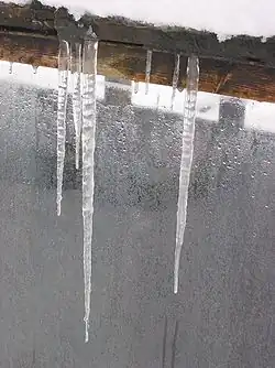 2 menší 30centimetrové rampouchy visící pod okapem -