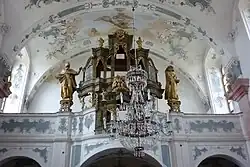 - Socha svatého Martina a svatého Jiřího na koních a svaté Anny a svatého Jáchyma z doby kolem roku 1765 zhotovené z eggenburského vápence na schodišti před kostelem