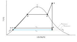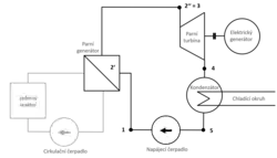 - Přes práce při izoentropických dějích (tj. expanze na turbíně a komprese v napájecím čerpadle):