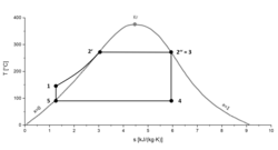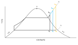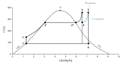 Aby se předešlo tvorbě mokré páry o nepřijatelně nízké suchosti na konci expanze, zavádí se přihřívání po částečné expanzi na parní turbíně. Expanze probíhá ve dvou fázích: V první fázi pára expanduje na větší tlak než je v kondenzátoru. Ve druhé fázi je pára v kotli přehřáta za konstantního tlaku a izoentropicky expanduje podruhé v nízkotlaké turbíně na tlak v kondenzátoru.[5]