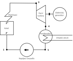Ideální Rankinův–Clausiův cyklus s přehřátou parou se skládá z následujících fází: 1 – napájecí voda vedena do kotle, kde se izobaricky ohřeje na stav 2‘ a následně vypaří do stavu syté páry 2‘‘, v kotli je pak izobaricky přehřáta do stavu 3, poté proudí do parní turbíny, kde izoentropicky expanduje až na tlak kondenzátoru 4. V kondenzátoru je páře izobaricky odebráno teplo a ta zkondenzuje na sytou kapalinu 5‘; k uzavření cyklu stačí pomocí napájecího čerpadla zvýšit tlak na stav 1.[2]