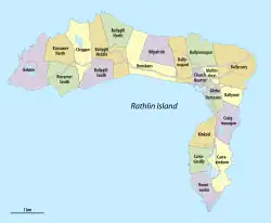 Ostrov Rathlin je rozdělen na 22 administrativních jednotek, tzv. townlands (irsky baile fearainn, což je nejmenší administrativní jednotka v Irsku).