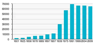 - 20. století: 1907 – 11 423 obyv.; 1939 – 29,8 tis. obyv.; 1973 – 53,9 tis. obyv.; 1975 – 57,1 tis. obyv.; 1991 – 69,4 tis. obyv.; 1999 – 66,5 tis. obyv.; 2000 – 66,8 tis. obyv.
