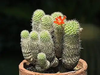 Květy vznikající na bázi těla, 45 – 55 mm dlouhé a 40 mm široké; květní lůžko 3 mm široké, olivově růžové, s malým množství šupin, v paždí šupin bílé, poněkud kadeřavé, až 3 mm dlouhé vlasy; květní trubka úzká, až 30 mm dlouhá a 2 – 3 mm široká, růžově červená až oranžově růžová, ke konci bledší až bílá; vnější okvětní lístky kopinaté, 12 – 15 mm dlouhé, 3 – 4 mm široké, oranžové, s lila středním proužkem a výraznou špičkou; vnitřní okvětní lístky poněkud širší a kratší, tupé, oranžové, k jícnu oranžově žluté; nitky bělavé, prašníky světle žluté; čnělka a blizna s 5 – 8 laloky bělavé. Plod malá, okrouhlá, tmavě červená bobule o průměru 4 mm, se šupinami s krátkými, bílými, kadeřavými vlasy. Semena černá, polokulovitá až přílbovitá, se širokým bazálním hilem a bradavčitou testou.