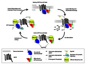 Přenos signálu pomocí GPCR receptorů je jedním z nejrozšířenějších příkladů signální transdukce, tedy přenosu signálu z vnější strany buňky směrem dovnitř. Z vnější strany se na tento typ receptorů váže tzv. ligand, což je v typickém případě hormon, odorant, růstový faktor či neurotransmiter. Po navázání těchto látek na vnější stranu membrány je aktivován na druhé straně membrány G protein, ten se odloučí od receptoru, putuje cytosolem a aktivuje zpravidla jiný enzym (např. adenylátcyklázu).[1]