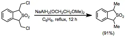 K roztoku 1,3-dihydro-1,3-bis(chlormethyl)benzo[c]-thiofen-2,2-dioxidu (0,584 g, 2,2 mmol) v 50 ml suchého benzenu bylo přidáno 0,80 ml (2,8 mmol) 70% benzenového roztoku NaAlH2(OCH2CH2OCH2)2 a vzniklý roztok byl po 12 hodin refluxován. Směs se ochladila na 0 °C a rozložila 20% kyselinou sírovou. Vrstva benzenu byla oddělena, promyta 10 ml vody, vysušena uhličitanem draselným a zakoncentrována za vzniku produktu v podobě žluté olejovité kapaliny, s 91% (0,480g) výtěžkem.[32]