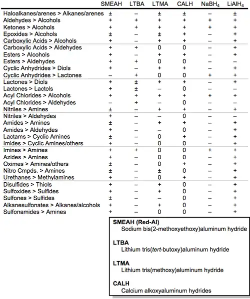 V tabulce níže jsou shrnuty redukce, které mohou být uskutečněny pomocí řady různých aluminiumhydridů a borohydridů. Symbol „+“ naznačuje, že redukce probíhá, „-“, že neprobíhá, „±“, že závisí na struktuře substrátu, a „0“ znamená, že není dostatek dat.